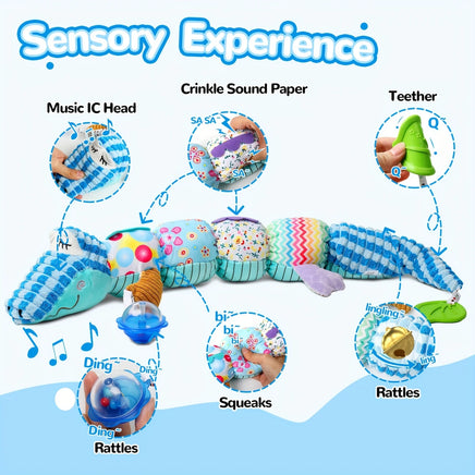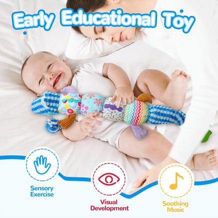 - Infant Musical Toy: This adorable caterpillar toy is not just a plush toy, but also a musical and rattle toy in one. The hidden music box in the head of the caterpillar plays lively and cute music when you press it, while the other parts of the toy are designed with a baby rattle, BB squeaks, and crinkle sound paper.